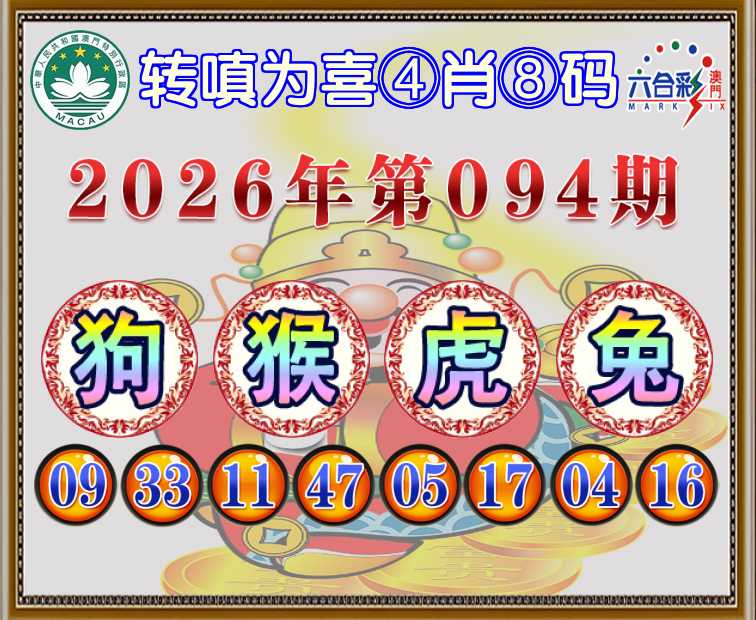 094期:〖转嗔为喜〗 ④肖⑧码【狗猴兔】开:虎17