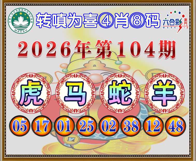 104期:〖转嗔为喜〗 ④肖⑧码【虎蛇羊】开:马01